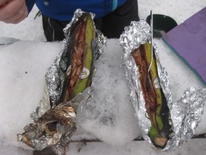 På torsdagen gick vi till Naturum och var där hela dagen. Vi åt både lunch och mellanmål där. Hamburgare till lunch och grillad banan med choklad till mellanmål. Medan vi lagade maten kunde man välja på att åka pulka, leka i buskarna vid backen eller vara i skogen och leka. Några hjälpte till med maten. Alla var trötta och glada när vi kom tillbaka till fritids!!