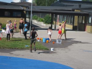 Alla som ville vara med hade badkläder med sig och de som ville hade också vattenpistol. Hade man ingen vattenpistol så fanns det gott om hinkar och flaskor att använda.