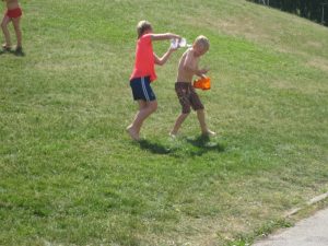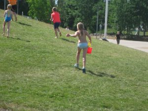 Efter mellanmålet samlades vi på gräset och gick igenom reglerna. Det var alla mot alla som gällde och målet var att alla skulle bli så blöta som möjligt.