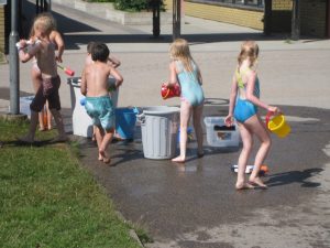 Alla som ville vara med hade badkläder med sig och de som ville hade också vattenpistol. Hade man ingen vattenpistol så fanns det gott om hinkar och flaskor att använda.
