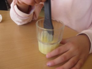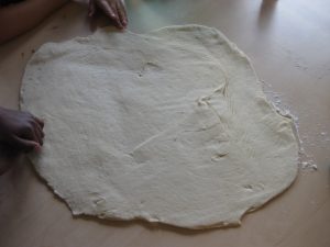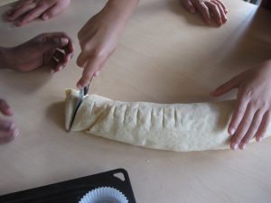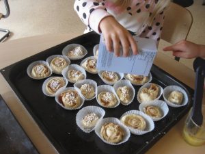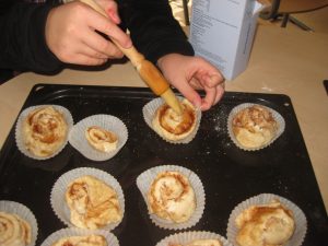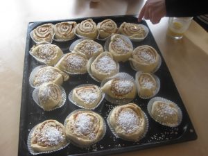 När förskoleklassen bakade delade vi upp gruppen så några st bakade och de andra hade fri lek. När degen jäst fick de som lekt komma in och baka ut. Och sen fick ett gäng pensla och sockra när bullarna jäst en gång till.