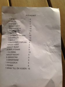 Idag har vi haft poängjakt. Det gällde att hitta så mycket som möjligt på listan på 20 min. Inte helt lätt. Men alla lyckades jättebra.