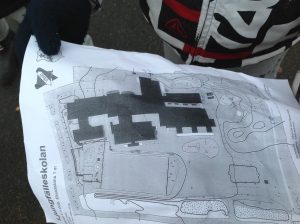 Med hjälp av skolgårdskartan gällde det att hitta olika stationer och utföra olika uppdrag, tex hitta tre runda saker på skolgården.