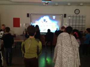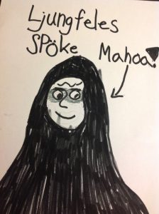 På onsdagen hade vi blivit inbjudna till Ljungfälles spökkällare. Därnere tog vårt eget spöke, Mahoa, emot oss. Han gav oss kluriga frågor och bjöd på läskigt godis.
