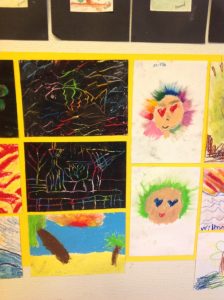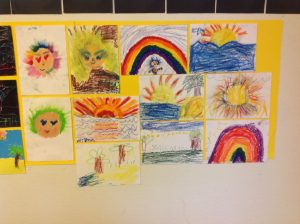 Idag har vi fortsatt att måla med pastellkritorna!! Tekniken går ut på att måla tjockt med kritorna och sen dra ut färgen med fingrarna eller med en vit krita. Uppgiften var att måla nånting med ljus, t.ex en solnedgång, regnbåge eller en sol. Sedan fick man måla vad man ville med.