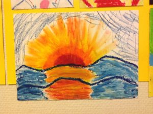 Idag har vi fortsatt att måla med pastellkritorna!! Tekniken går ut på att måla tjockt med kritorna och sen dra ut färgen med fingrarna eller med en vit krita. Uppgiften var att måla nånting med ljus, t.ex en solnedgång, regnbåge eller en sol. Sedan fick man måla vad man ville med.