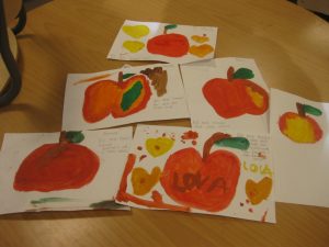 Vi målade äpplen med vattenfärg. Sen pratade vi om hur en bra kompis är och alla skrev ner en eller två meningar på dator som vi ska klistra upp tillsammans med äpplena.