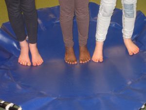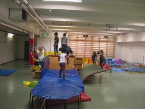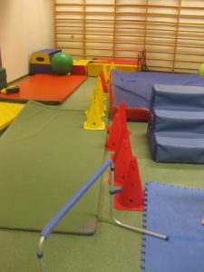 Idag har vi varit i motionshallen i källaren. Full fart med kojor, fotboll, hinderbana och datten.